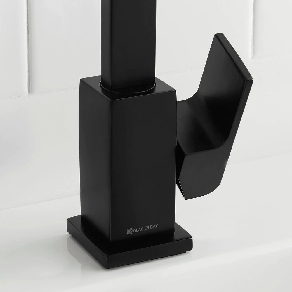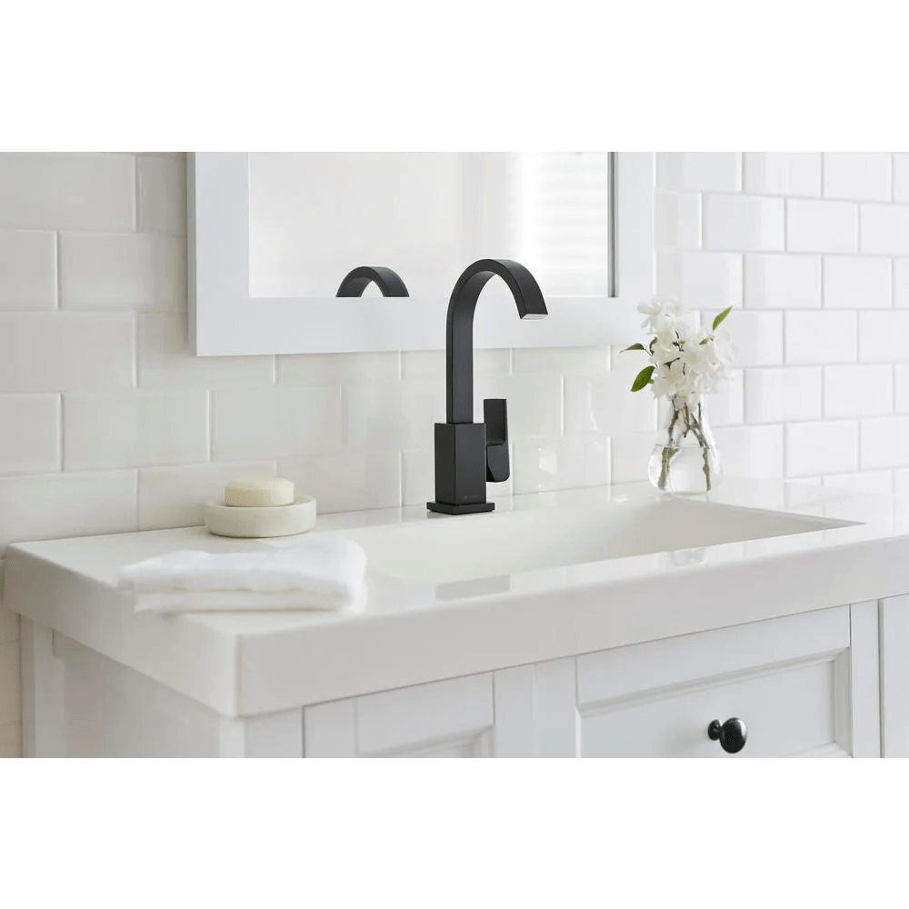 The Glacier Bay Farrington 4 in. Centerset Single-Handle High-Arc Bathroom Faucet in Matte Black features a unique ribbon water flow. WaterSense certified with a 1.2 GPM water flow and ceramic disc valves to reduce water use without sacrificing performance, this faucet exudes a timeless sophistication that will never go out of style. The high-arc spout allows for plenty of sink space. This faucet features the exclusive ClickInstall drain assembly for quick and easy installation.