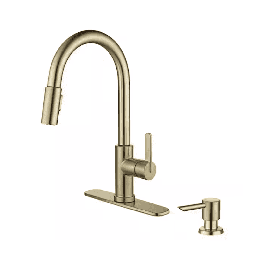 This single-handle pull-down kitchen faucet in brushed gold is designed to handle everyday kitchen tasks with strong performance and easy control. It includes a powerful turbo spray option for tougher cleaning, along with an aerated spray for regular use. The single lever makes it simple to adjust water flow and temperature, and the faucet delivers a 1.8 GPM flow rate. A ceramic disc cartridge helps provide drip-resistant performance. Installation is simplified with a fast-mount mounting system, and a matching soap dispenser is included.