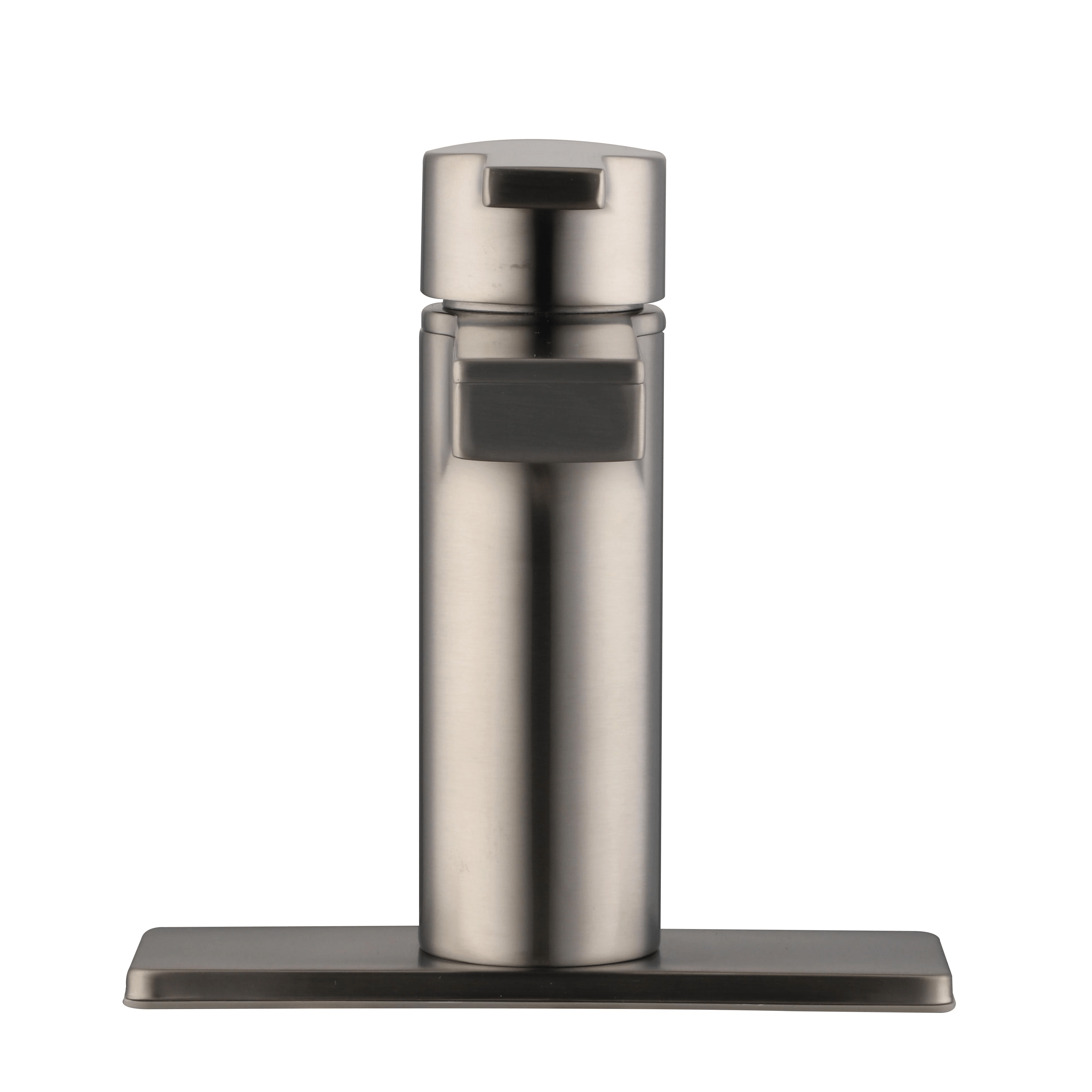 Modern Contemporary Centerset Single-Handle Low-Arc Faucet features sleek lines, contemporary styling and brushed nickel finish. It is WaterSense certified with a 1.2 GPM flow rate and the ceramic disc valves ensure drip-free operation. And the exclusive ClickInstall drain assembly makes for a quick installation.