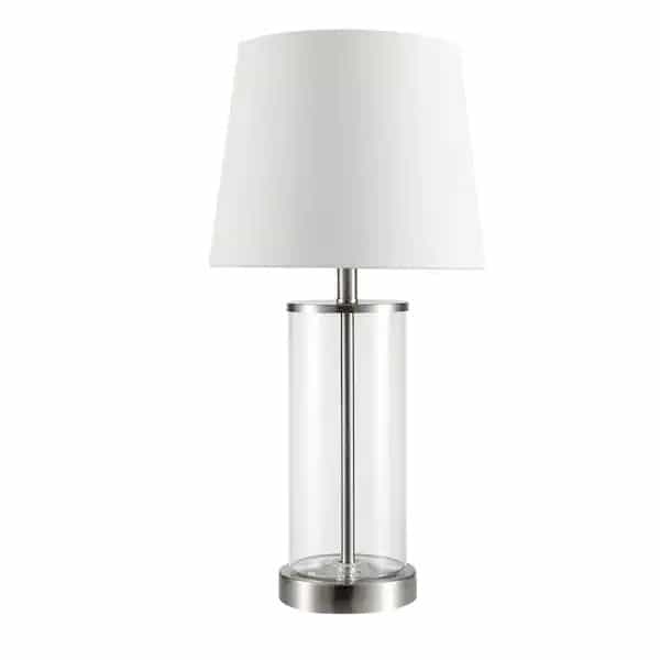 - Effortless placement: 5 ft. cord clear glass base and white linen shade lets you place the Maya table lamp anywhere you need extra light