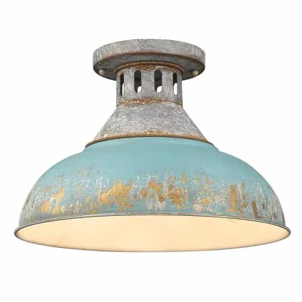 Kinsley has a rustic, vintage appeal that is perfect for homes with eclectic or farmhouse decor. The Aged Galvanized Steel frame balances the numerous antique shade color options offered in this collection. The hand-painted series has a distressed, weathered look. Choose a shade that fits your existing color scheme or opt to design around a variety of vintage shade option.