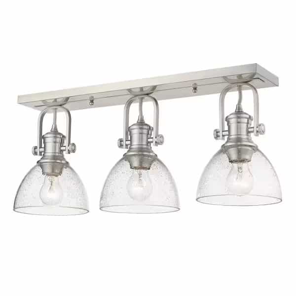 Offered in three smooth finishes, with two glass options, Hines is suitable for a variety of decors. The transitional style is a marriage of traditional silhouettes with modern finishes. The black, pewter and chrome fixtures are paired with opal or seeded glass shades. This 3-light semi-flush is approved for damp locations and may be mounted on the wall or ceiling.
