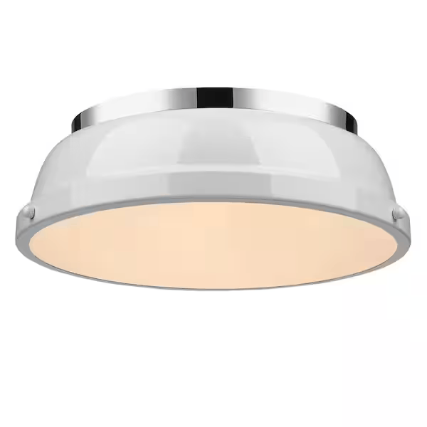 Transform the look of your room with this classic, vintage-inspired fixture by Golden Lighting. Golden Lighting’s Duncan collection is contemporary style with an industrial feel. The collection features a variety of simple, traditional silhouettes that are a nod to a bygone era. A variety of plated and painted metal shade finishes are offered in combination with durable Aged Brass, Chrome or Pewter fixture bodies. Rubbed Bronze fixtures are paired with Rubbed Bronze shades. This flush mount is perfect for modern or contemporary style home decors and works perfectly in a kitchen, hallway or bath. This 14 in. flush mount is UL approved for damp locations.
