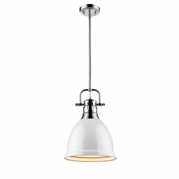 Transform the look of your room with this classic, vintage-inspired fixture by Golden Lighting. Golden Lighting’s Duncan collection is contemporary style with an industrial feel. The collection features a variety of simple, traditional silhouettes that are a nod to a bygone era. A variety of plated and painted metal shade finishes are offered in combination with durable Aged Brass, Chrome or Pewter fixture bodies. Rubbed Bronze fixtures are paired with Rubbed Bronze shades. This small, rod-hung pendant features a may be hung individually or grouped over a bar.