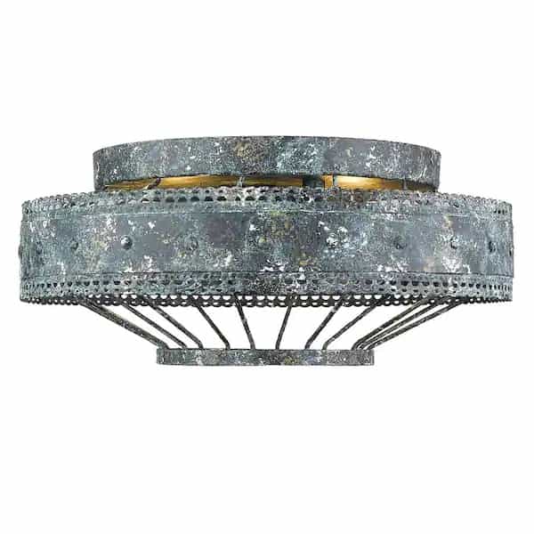 Ferris is a casual, vintage-inspired design that was created for eclectic or farmhouse decors. The unique metal work features a scallop detail and a multi-layered, hand-painted finish. The blue verdigris patina finish is applied with white and gold accent to create a chic, but weathered look. This flush mount creates a generous open area for widespread ambient-lighting.