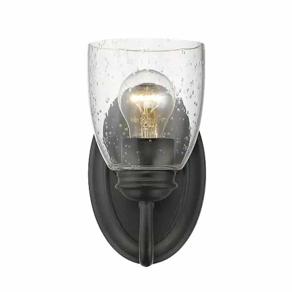 Simple and elegant the Parrish collection is a lovely blend of masculine and feminine, old and new. A versatile, smooth black finish overlay the graceful, traditional arms. Matching socket covers add a touch of color to the clear, textured seeded glass. The contemporary shape of the glass and simple finish gives this otherwise classic silhouette a modern update. Perfect for traditional to transitional interiors, this charming collection is a timeless beauty. This family offers a variety of fixtures to suit all of your interior lighting needs. Sconces are popularly used in halls, stairways, and foyers as accents, but this 1-light bath vanity is UL approved for damp locations.