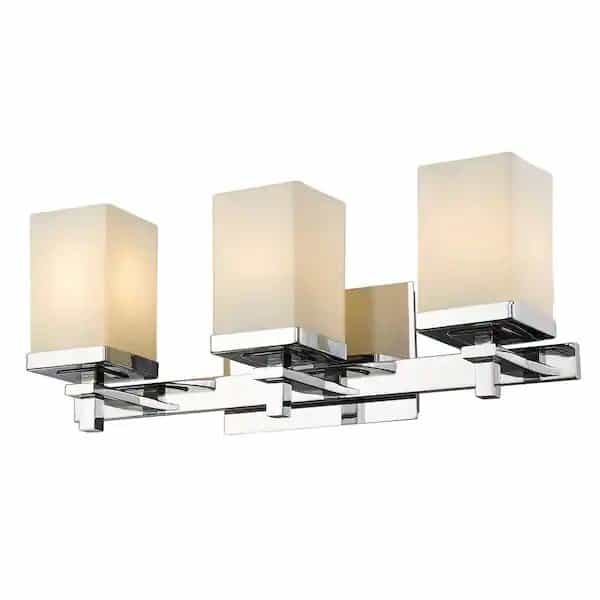 This clean modern design is suitable for transitional to contemporary homes. The polished Chrome finish and Square Opal Glass shades continue the elegant look. The fixture is UL/cUL approved to be used in damp locations and provides well diffused light over a vanity or mirror. The fixture may be mounted facing up or down to suit your tastes.