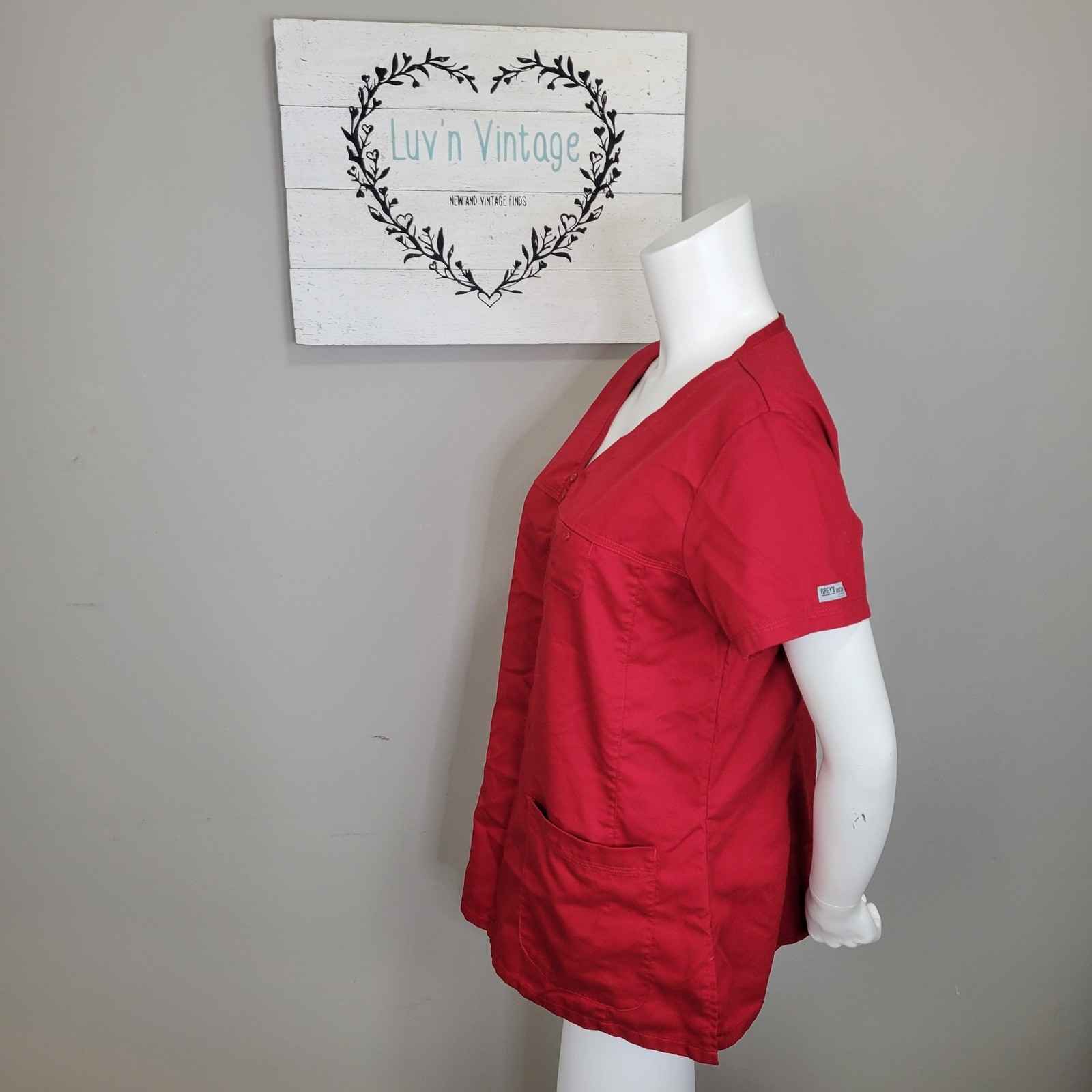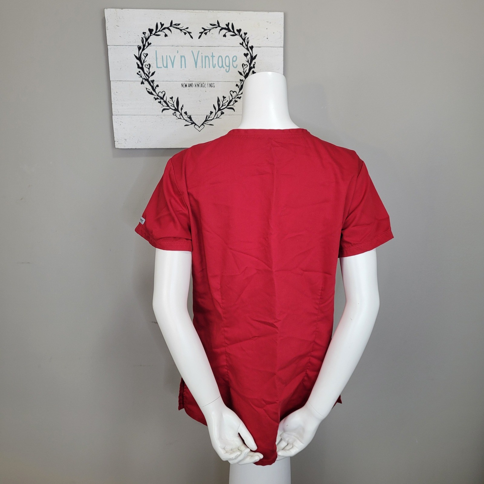 Keywords: scrub top, healthcare, medical, nurse, doctor, red, v-neck, short sleeve, professional wear, workwear, uniform, comfortable, functional