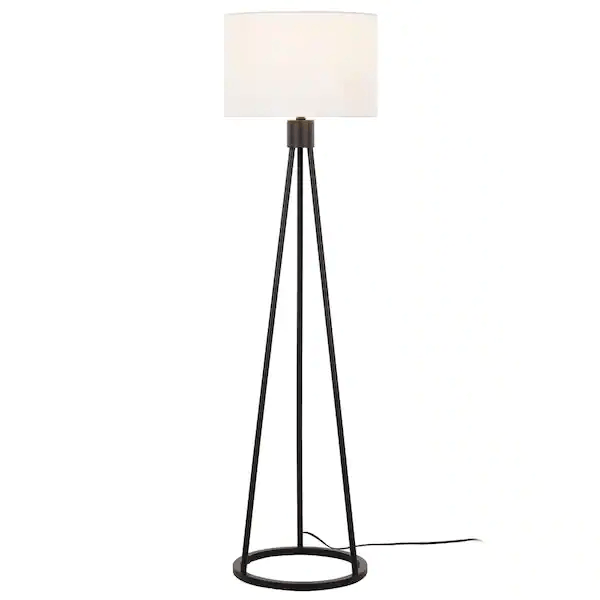 Brighten your space with the mid-century-inspired Hampton Bay 56.2″ Metal Tripod Higgins Floor Lamp. This lamp features a sturdy metal tripod frame in modern black satin finish, and matching black satin hardware for a seamless and elegant look. Topped with a 15″ wide white linen drum shade, this lamp provides ample ambient lighting without harsh glare. Uses one standard A19 E26 light bulb, max 16-watt LED or 100-watt incandescent equivalent (light bulb not included). A black 60″ power cord completes the lamp’s contemporary look.