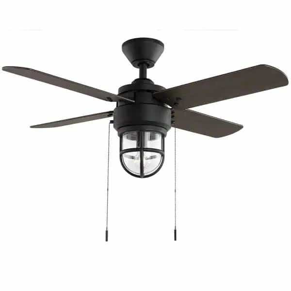 Drawing from nautical inspiration, the 44 in. Cedar Lake ceiling fan by Hampton Bay combines style and performance to produce this beauty. The Cedar Lake is damp rated making it perfect for outdoor covered locations like porches and patios and it looks great indoors as well. The fan’s stark matte black finish is paired with 4 reversible blades in wenge and espresso finishes to complement your decor. The light features a stunning clear seeded glass shade enclosed in a decorative cage and uses 1 vintage style 6.5-Watt LED bulb (included).