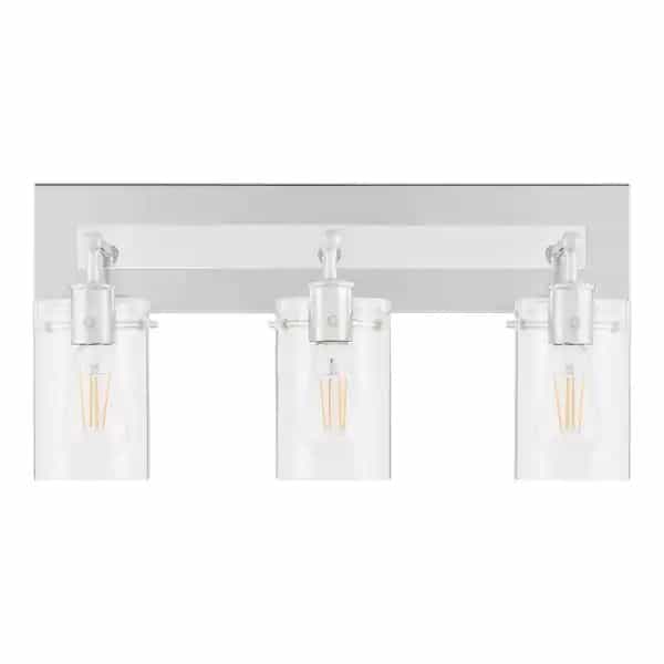 Enhance your home interior with this Hampton Bay Regan 3-light vanity light. Great for your bedroom or bathroom, the clear glass shades and chrome finish create decorative charm. This dimmable fixture comes with all mounting hardware for a convenient installation, and you can install the shades up or down. Steel construction ensures lasting use.