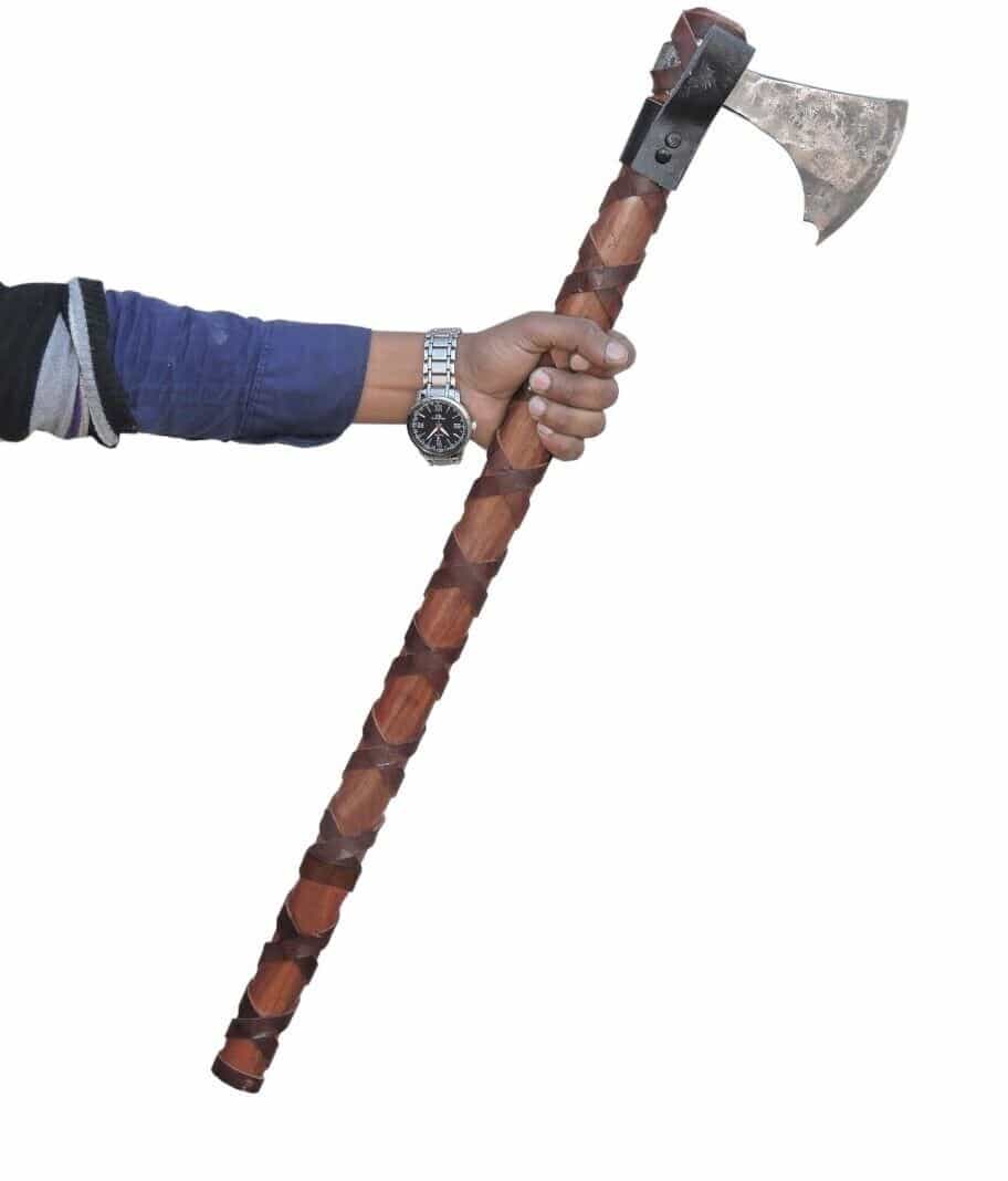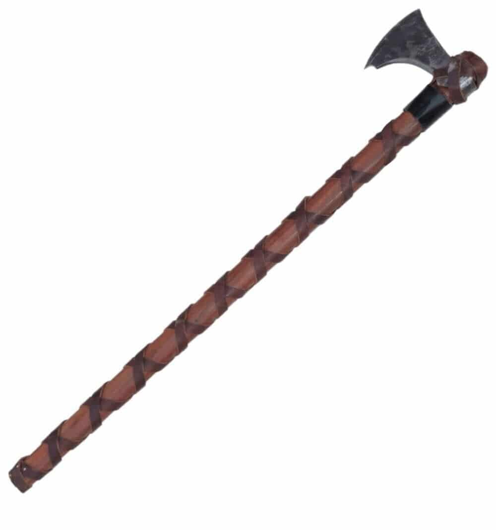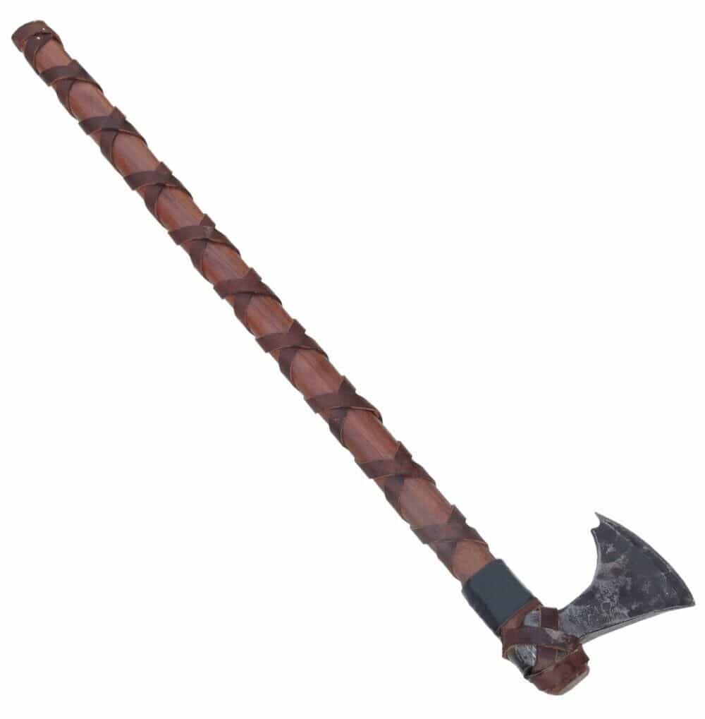 Fully Functional 10th Century inspired Viking AxeHaft features crisscross leather wrappingPerfect for historical reenactment, training, and combatNot suitable for wood cutting or other chores