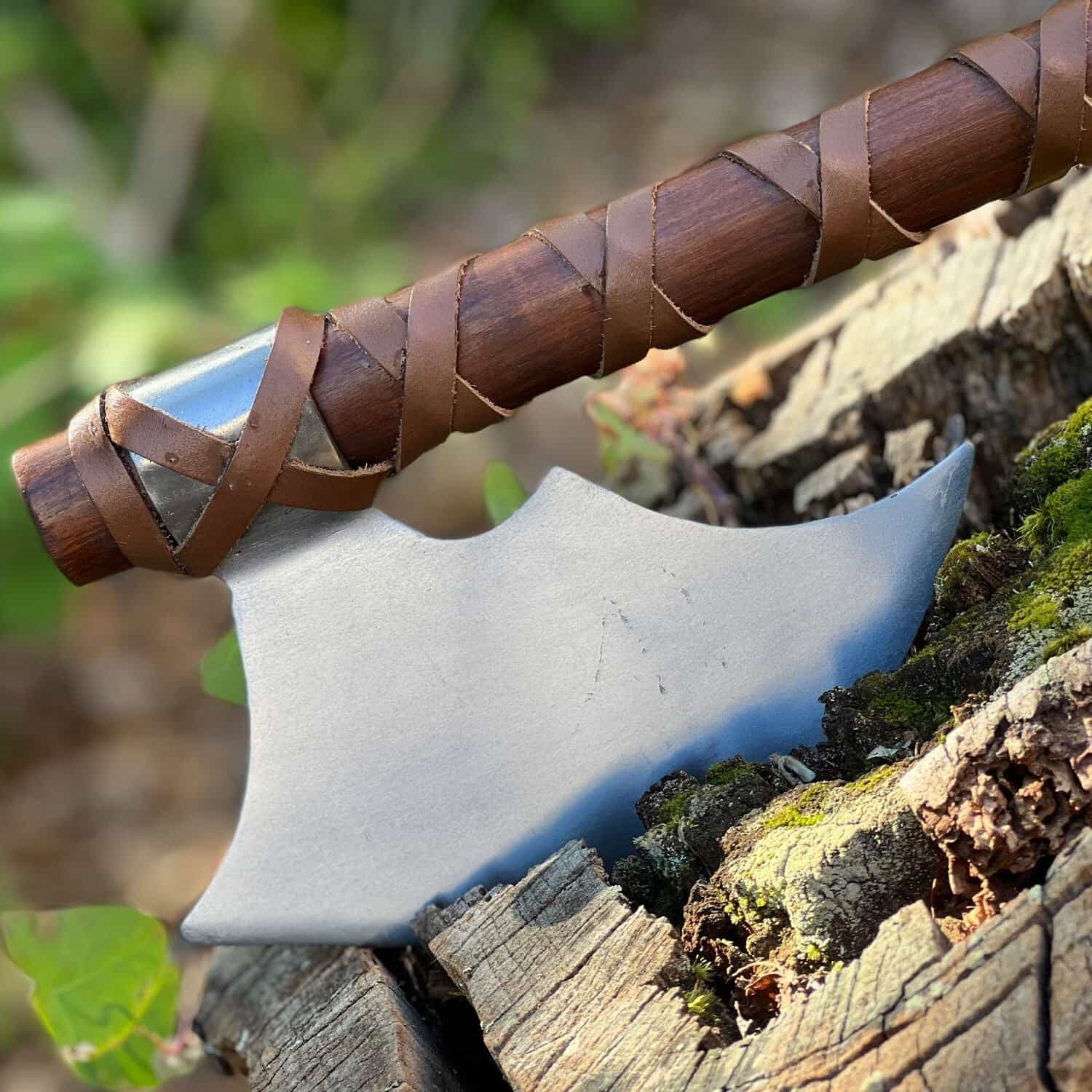 A battle axe inspired by old Viking designHead is attached to a wooden haftHaft is wrapped with leather lacing for design and a secure holdA battle-ready and fully functional axeDesigned for training, reenactment, and combatNot suitable for wood cutting or other chores