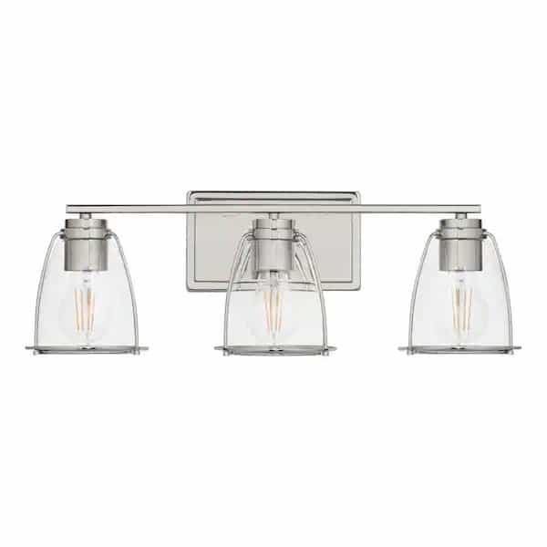 Oversized clear glass shades own the design without taking away from your space with the Brooke Park 3-Light Bath Vanity Light. Each shade features a metal rim at its open bottom. Sleek light bases align in a linear fashion along a smooth horizontal bar anchored to a beveled backplate. The design is coated in a crisp polished nickel finish sure to elevate any new traditional style setting. Bulbs not included.