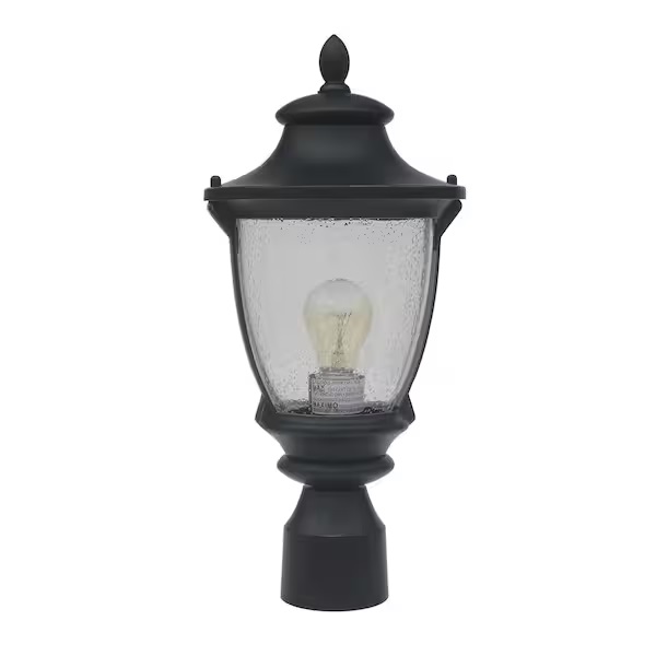This classically styled post mount lantern from Home Decorators Collection is sure to brighten the look of any home. The hand applied black finish with gold highlights will illuminate as well as decorate. The clear seedy glass augments the light from the 100-Watt bulb (not included). Die-cast aluminum construction ensures long-lasting beauty and durability.