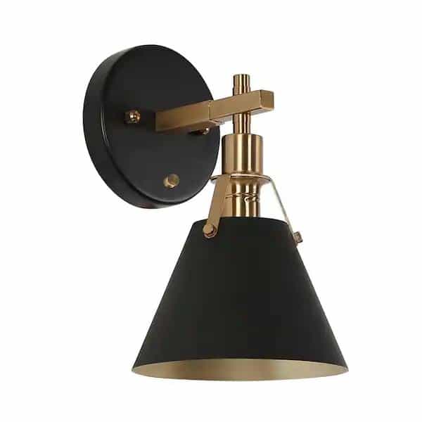 Differing from other metal wall sconces, this 1 has an open-design bell lamp shade. Find the lighting atmosphere you love with this black and vintage gold 1-light modern wall sconce with black shade. Beautiful light shadows can be cast upwards and downwards at the same time ensuring enough illumination while providing a chic flair. The clean lines and unique slant cut of the shade give this trending wall lamp a modern feel, perfect for an industrial urban loft or a retro-contemporary bedroom.