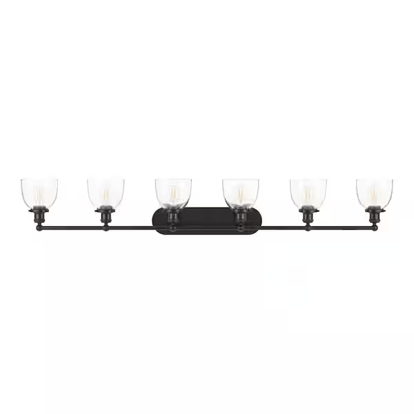 The Home Decorators Evelyn collection of bathroom vanities offers Industrial styling in a variety of finishes and sizes. This 58.5 in. 6-Light bathroom light comes in a sleek Matte Black finish with clear glass shades. Rated for damp indoor installations, the Evelyn vanity light is sure to add charm and elegance to your bathroom mirror area. Be sure to check out the entire Evelyn collection for options and configurations to fit other areas of your home.