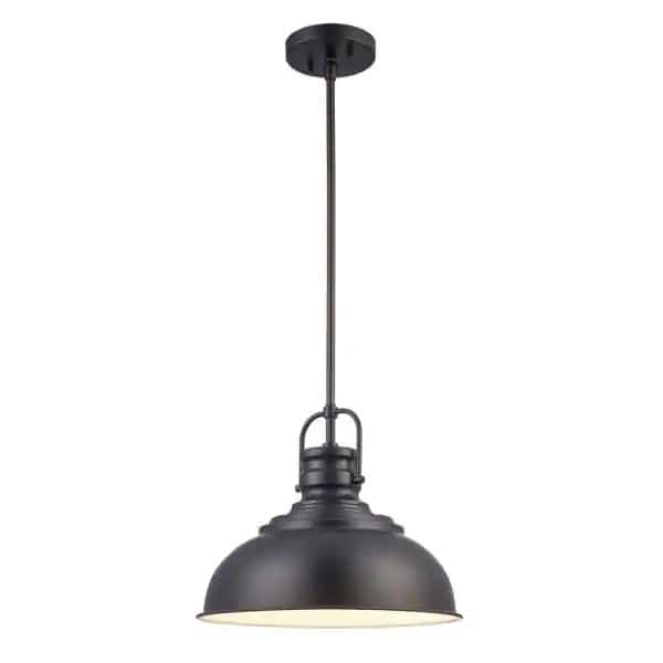 The Shelston Collection from Home Decorators exhibits industrial indoor lighting with farmhouse appeal, ideal for a variety of home styles from traditional to contemporary. Enhance your entryway, kitchen, or dining room with the updated styling of this Shelston 13 inch round pendant. Highlighted by a simple metal dome shade and black finish, this fixture will add a unique design and functional illumination to your home. The pendant body hangs from a lantern-style handle and matching black extension rods, of which multiple lengths are included for an adjustable hanging height. The smaller size works well when hung as a single unit in smaller spaces, or when installed as a set along a linear kitchen island or bar table. Shop the Shelston Collection for additional finish options, sizes, and coordinating indoor ceiling lighting.