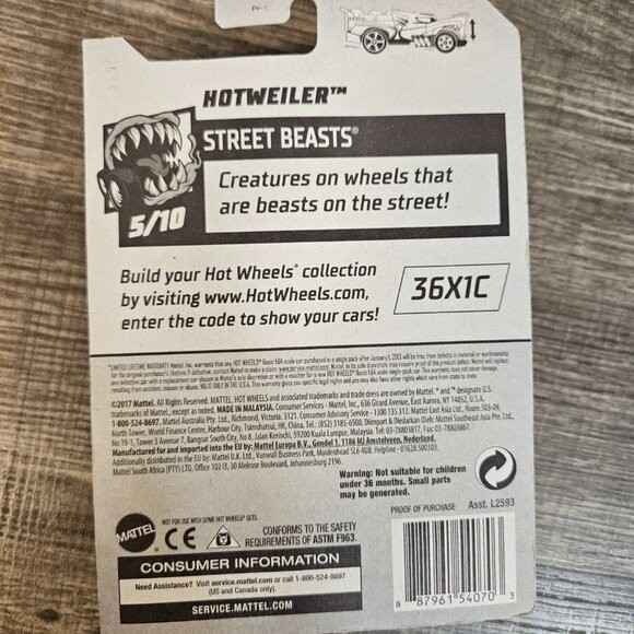 Hot Wheels 50th Anniversary. Hotweiler 5/10 113/365. HW Street Beasts. Some Cards may have soft corner(s), slight bend or showing crease or may have some text removed due to removal of a previous sticker. Like New Condition. ITEM #2113