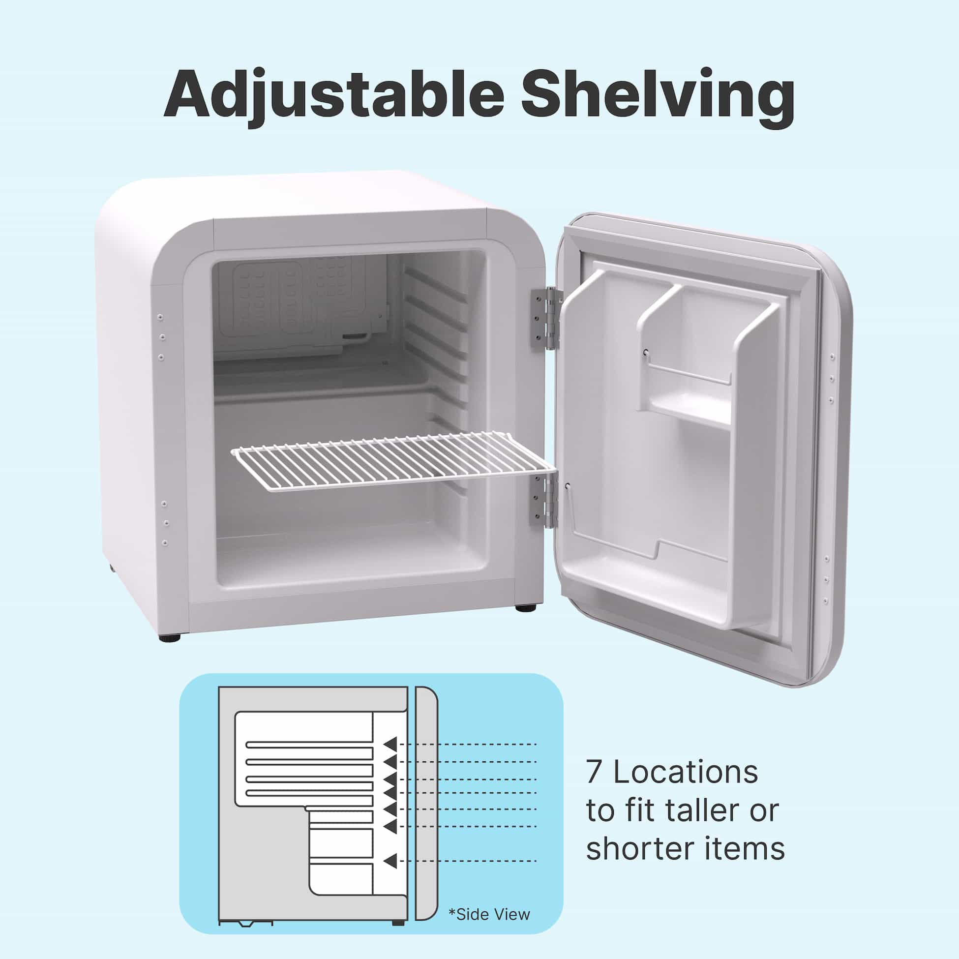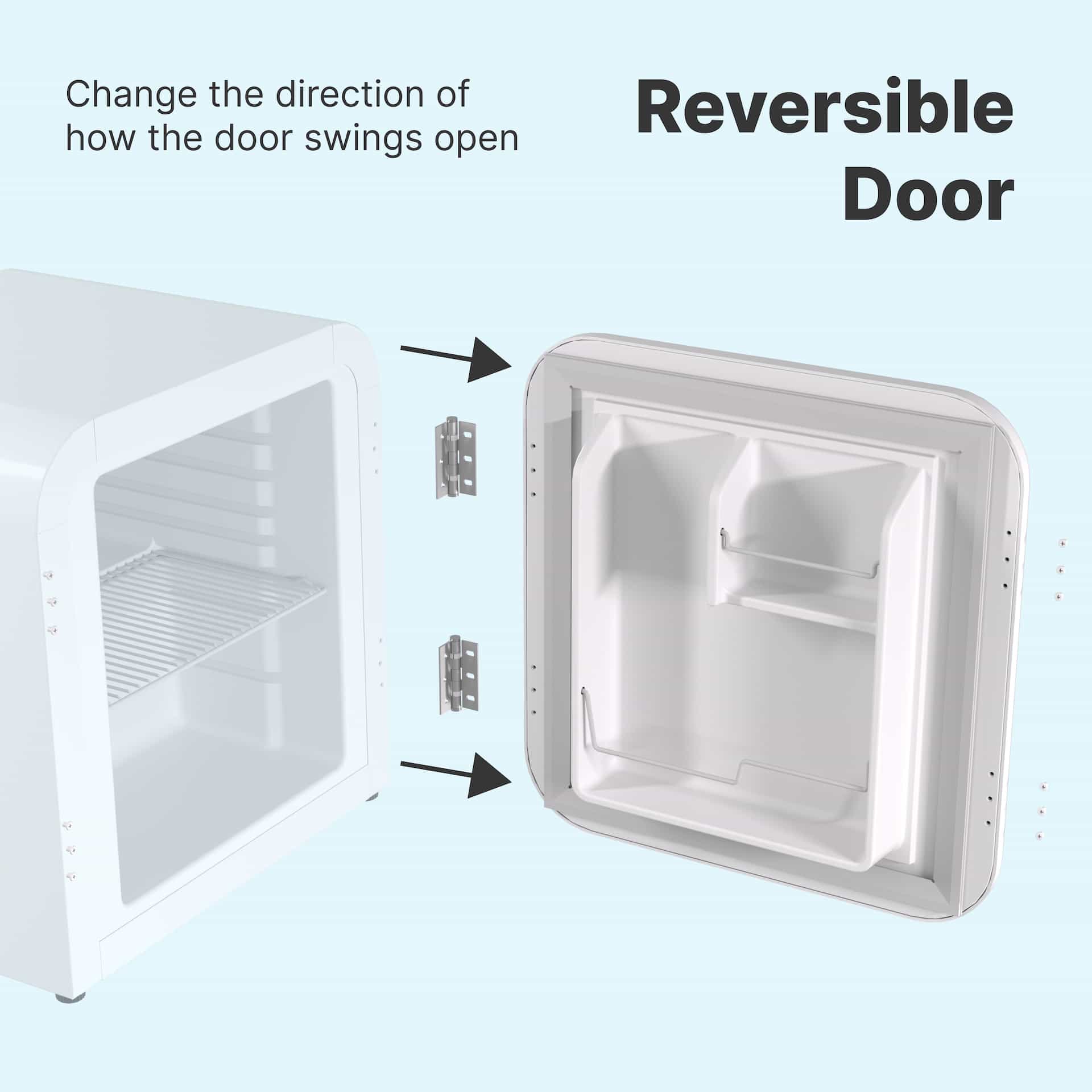 This SnowLion 43L Retro Style 1.5 Cu. ft. Freestanding Mini Fridge in White offers a stunning vintage look to brighten up any bar, kitchen, garage, or living space and add a little bit of retro charm. It comes in a convenient 43-liter mini-size, making it ideal for placement on top of bench-tops while still providing plenty of space to keep your drinks perfectly chilled on a hot summer day. Because the door is solid, it helps to improve insulation. This makes the fridge very energy efficient and helps keep energy costs down. This freestanding mini fridge in white has storage in the door and a coated shelf, so even though it’s small, it has a lot of space inside. To top it all off, the SnowLion Retro Style Compact Bar Fridge comes in three stunning colors to complement any décor: piano black, white, and radiant red.
