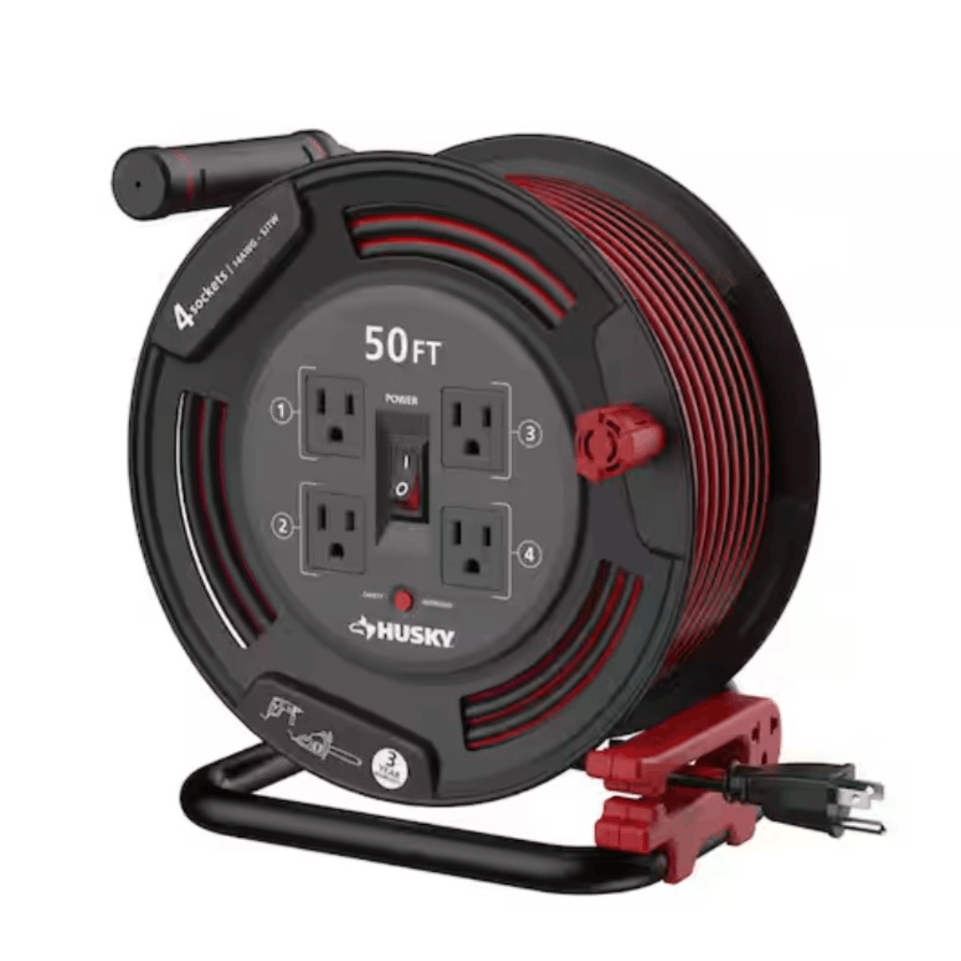 The Husky Cord Reel with 50 ft. Extension Cord and 4 Power Outlets is an ideal power solution for your garage, backyard, or workshop. Its tangle-free cord management system keeps cords organized and ready for the next use. A built-in cord locking mechanism ensures cords stay securely in place, and the heavy-duty comfort grip handle makes rewinding smooth and easy. The durable metal frame and high-visibility outdoor-rated cord make it a reliable and rugged choice for a variety of power needs.