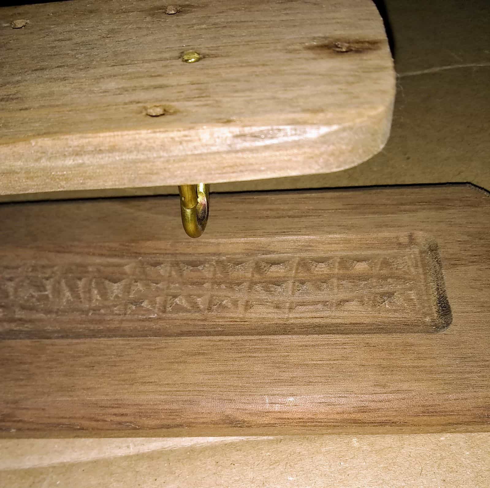 This incense holder is wood with a carved decorative area under where the incense sits. The incense gets put through a hole in the back and the front of the stick sits on a hook. It is in good shape yet, maybe could use some new stain if you want it darker in color. Measures about 10 inches long by 2 1/2 inches by 2 1/2 inches. Handcrafted by Slideburner. American made.