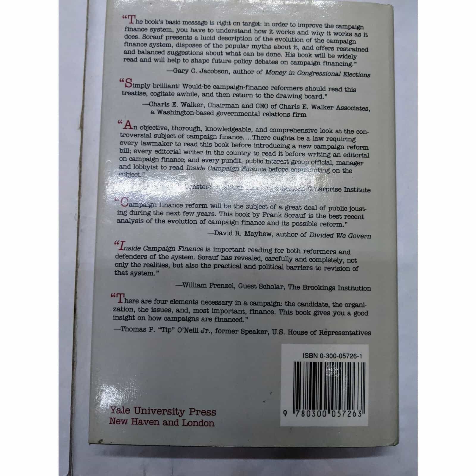 Inside Campaign Finance Myths & Realities by Frank J. Sorauf Book