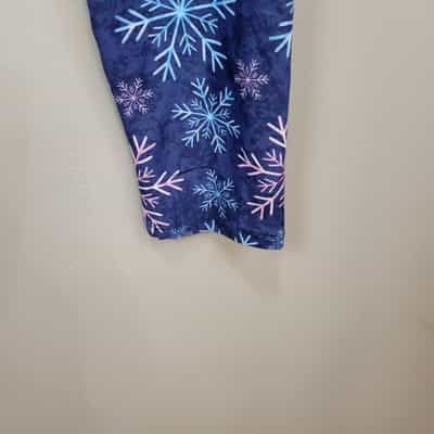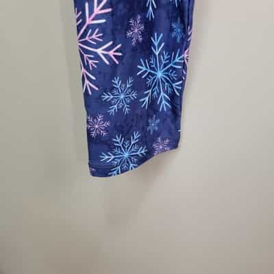 Soft and comfy pair of leggings made of polyester and spandex with pretty pink and blue snowflakes and a wide waistband!