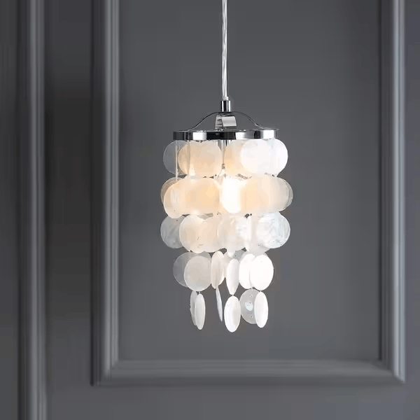 Accent a breakfast nook with the stylish charm of this shell chandelier. Featuring chrome hardware gleaming in contrast to the soft iridescence of round capiz shells, strands of varying lengths shade the light and offer shimmering flair. With an adjustable drop, this pendant can extend from 14.5 in. from the ceiling all the way to 86.5 in. for higher ceilings.