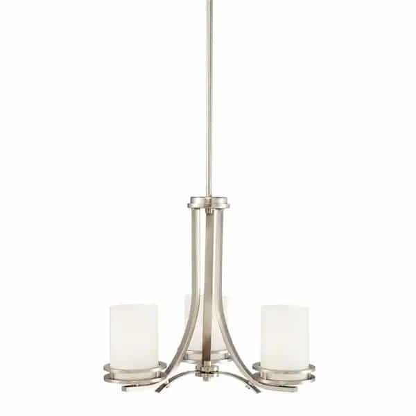 The KICHLER Hendrik 16.75 in. 3-Light Brushed Nickel Chandelier serves as an attractive style statement for your home. It features satin etched cased opal glass shades that create a soft glow when illuminated. The chandelier has a durable steel construction, ensuring long life and minimized maintenance. Its contemporary design and brushed nickel finish accentuate the visual appeal of any decor. This chandelier is ETL listed for use in dry locations, making it an ideal addition to your dining room, living room, bedroom and more.