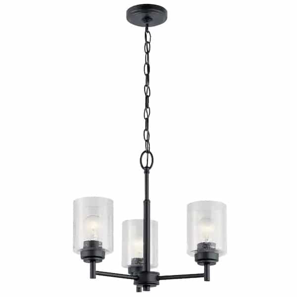 Enhance the visual appeal of your decor with the KICHLER Winslow 15.25 in. 3-Light Black Mini Chandelier. It features an elegant design with a Black finish that is sure to accentuate any contemporary-style decor. The clear glass diffusers of this chandelier provide bright illumination to add a radiant glow to your space. This chandelier can be installed with the glass facing up or down to create beautiful ambient lighting.