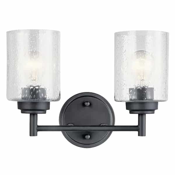 The KICHLER Winslow 12.75 in. 2-Light Black Vanity Light illustrates the setup of your bath vanity. 2 clear seeded cylindrical glass shades cast a scattered glow to evenly light up your bath. A shiny Black finish completes the look and gives your wall a radiant touch.