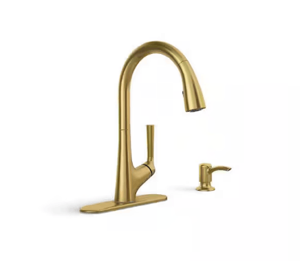 With its sleek lines and high, arched spout, the Elmbrook pull-down kitchen faucet brings a contemporary touch to a timeless design. Crafted for easy installation, it features high-quality materials that ensure lasting, reliable performance. The pull-down sprayhead offers two spray options, switching seamlessly between stream and Sweep spray, and includes a convenient soap/lotion dispenser.