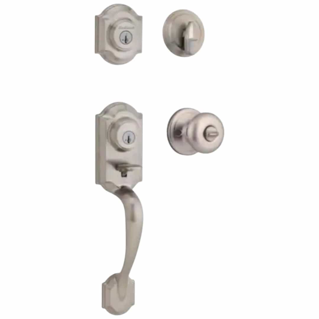 Upgrade your entryway with a stylish and secure handleset from the Signature Series. The Montara handleset provides two locking points—at both the deadbolt and the handleset—for enhanced protection. An adjustable through-bolt at the bottom allows for quick, hassle-free installation, fitting pre-drilled holes with ease. With its arched design and Satin Nickel finish, this handleset combines reliable security with a modern, elegant look. The latch bolt operates with a thumb piece on the outside and grip on the inside, while the deadbolt uses a key on the outside and a thumb turn on the inside.