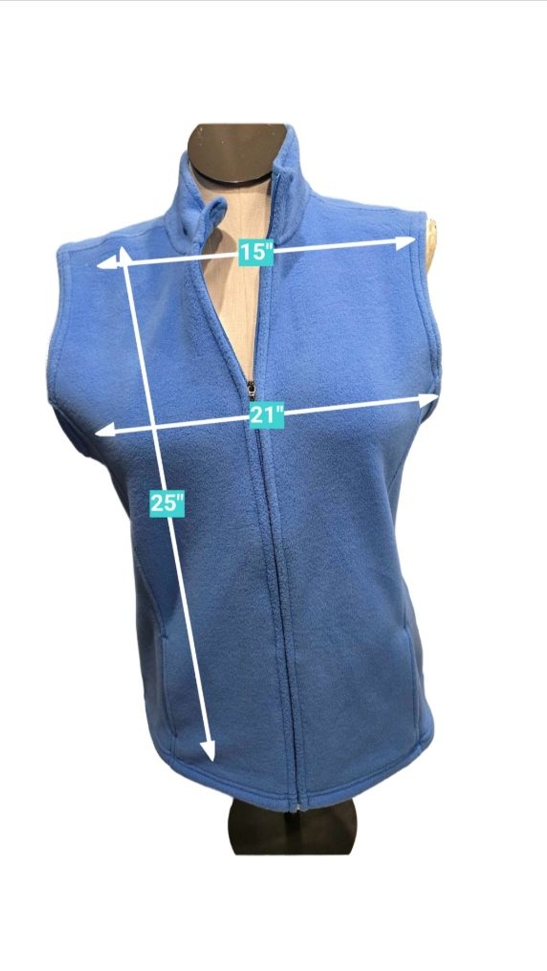 This is a pre-owned L.L.Bean women’s full-zip fleece vest in a solid blue color. The vest features a stand-up collar and a full-length zipper closure. It has a sleeveless design with finished armholes and two visible side pockets. The fabric appears to be fleece, and the care tag indicates it is made of 96% polyester and 4% Lycra® spandex, with a size L-REG. Measurements show an approximate 15″ shoulder width, 21″ chest width, and 25″ length. The vest shows light signs of wear consistent with a pre-owned
