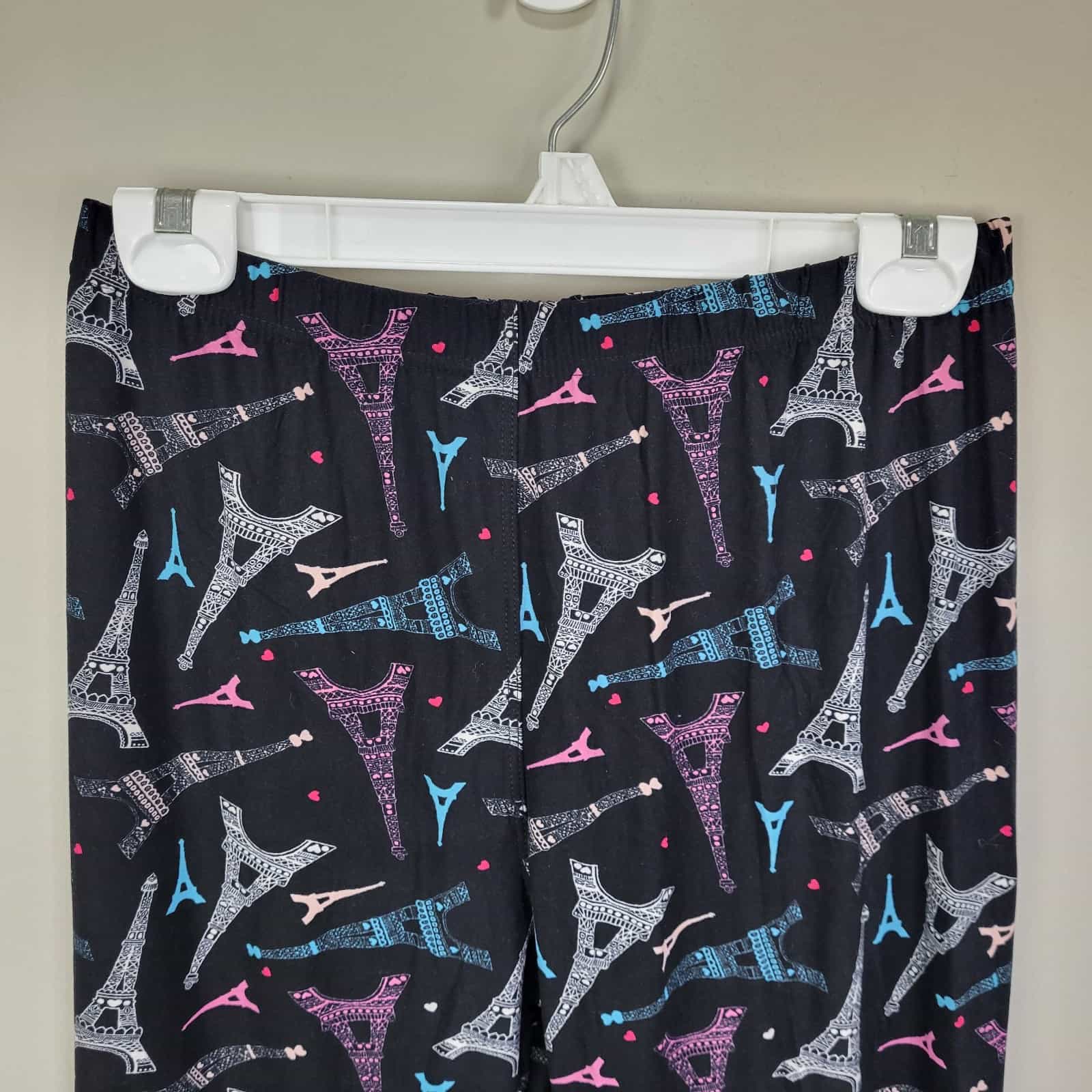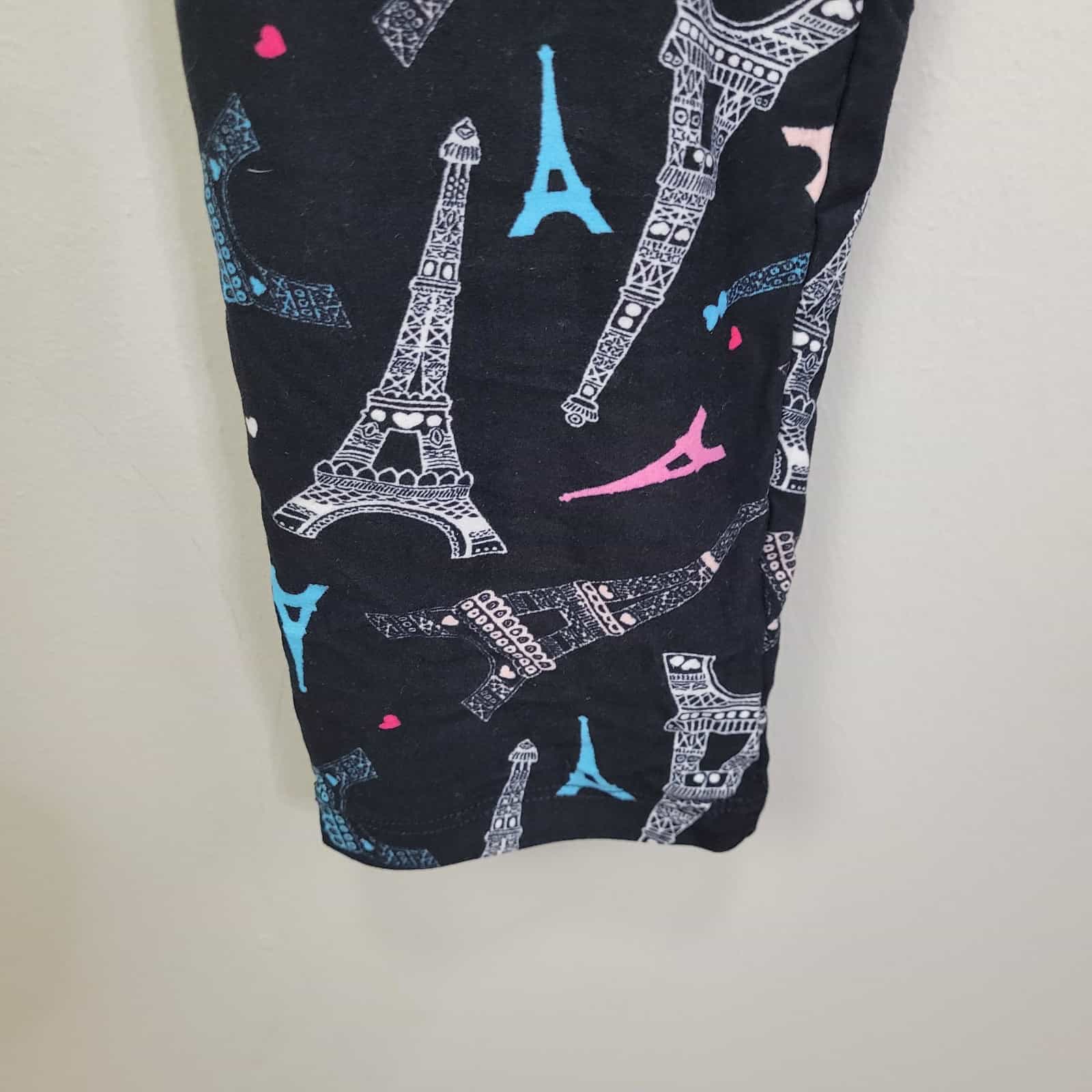 Soft and comfy pair of black leggings made of polyester and spandex with an all-over pastel Eiffel Tower print!!