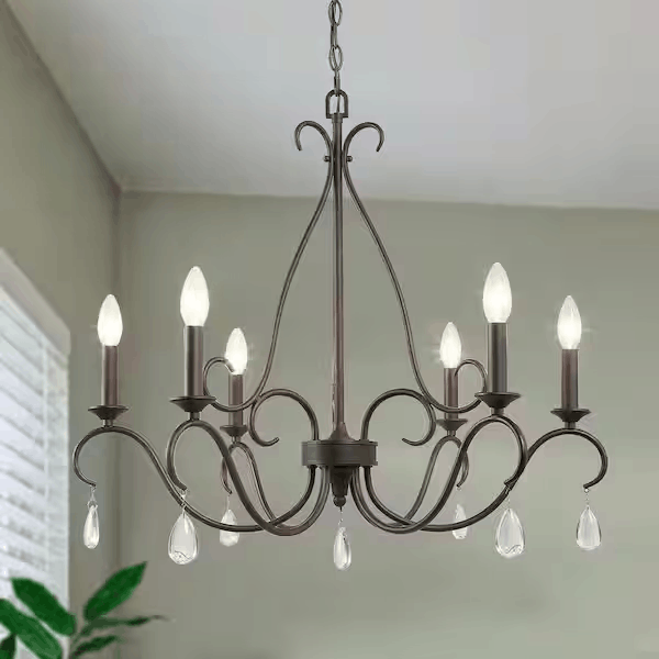 Combining the classic French Artisanship with Rustic Farmhouse sensibilities, this Transitional 6-Light Farmhouse Dining Room Candlestick Chandelier by LNC Esquilin Collection is a charming blend of vintage industrial and modern rustic elements for a timeless design. Hand-forged out of iron with an antique rusted bronze finish, the six classic scrolling arms design retains the traditional French Country Chandelier silhouette but is accentuated by the seven beautiful crystal pendant drops on the bottom for a more detailed and contemporary look. Using candelabra-style bulbs (not included) to enhance the elegant touch of your home. This chandelier light fixture is 28 in. W and a 60-in. adjustable hanging chain are included for you to customize the desired look. Perfect size in use over your kitchen island, dining room table, bedroom, foyer, and entryway. It blends function with style for a unique look that is sure to impress. Listed by UL for proven durability without compromising function and aesthetic value.