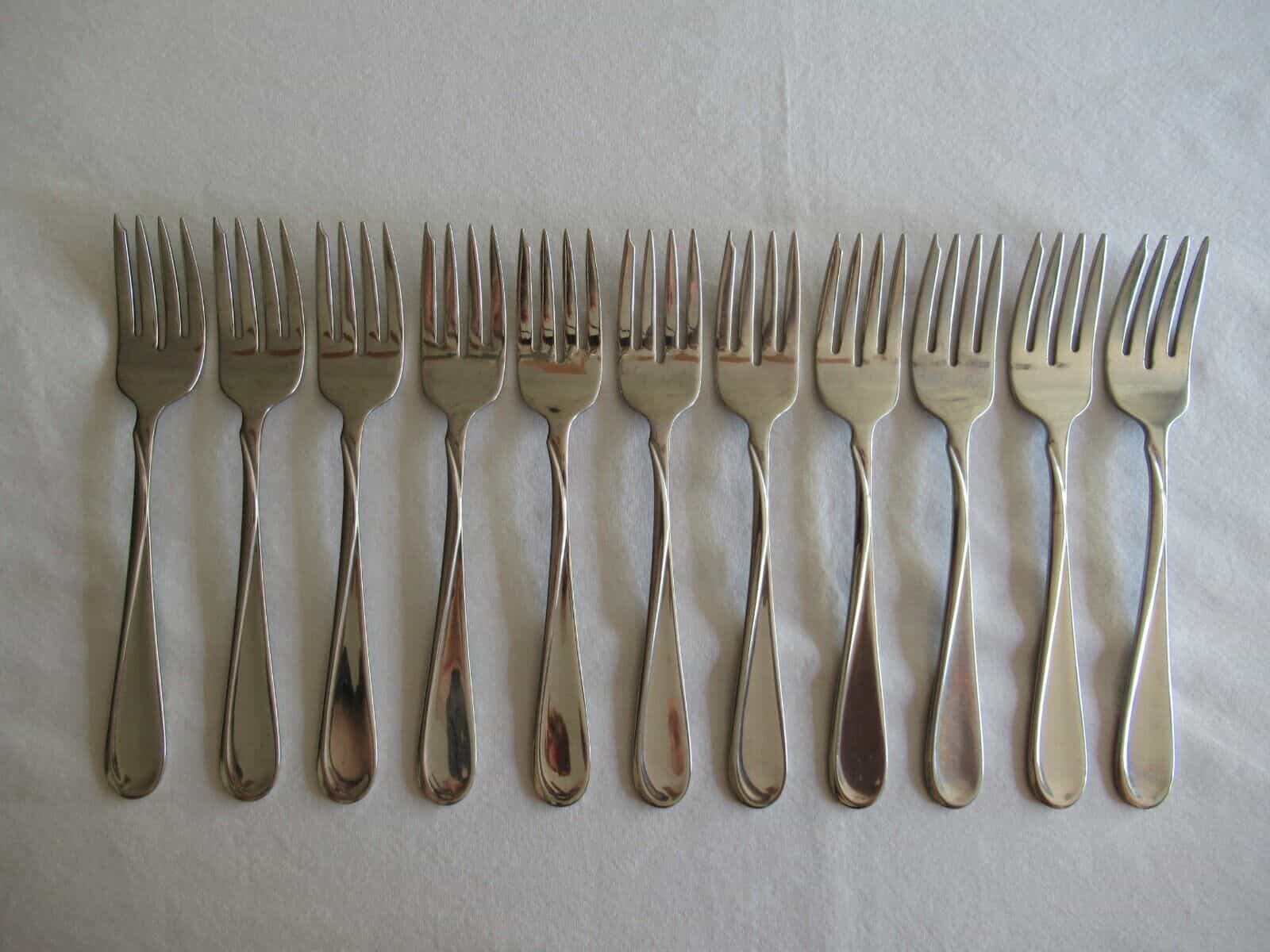 Good used condition with some normal wear on 10 of the forks as pictured. One of the pieces has garbage disposal. That is why I wrote 10 + 1.