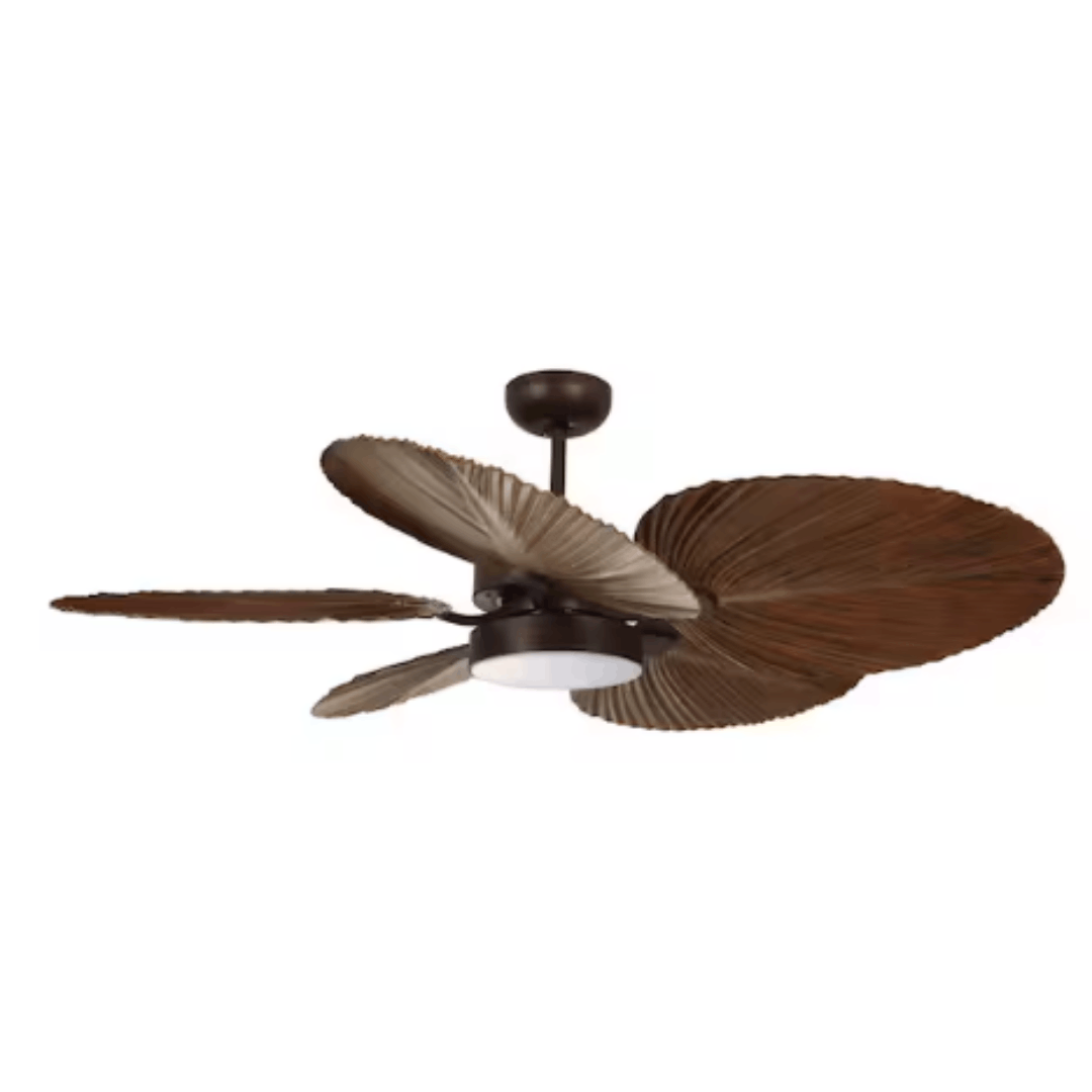 - Oil rubbed bronze housing with dark koa palm-style blades