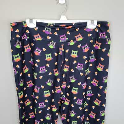 Soft and comfy pair leggings made of polyester and spandex with a whimsical owl and candy corn print!
