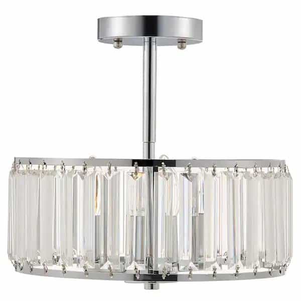Add some sparkle to your life with this unique modern chandelier. This 11.8 in. semi flush mount ceiling light fixture features 3-bulbs nestled inside a drum shade composed of 34 angular crystal prism rods. The chrome steel canopy embodies the polished shine of modern decor while providing corrosion-proof performance for your bedroom, living room, or dining room. Dimmer compatible, this crystal ceiling light can also go from flattering and cozy candlelight to cool bright daylight to match your different needs. Fitting with home decor from rustic farmhouse to industrial minimalist, the ambient light from its three 60-Watt E12 bulbs (not include) will impress every visitor to your home and shine new light on your home.