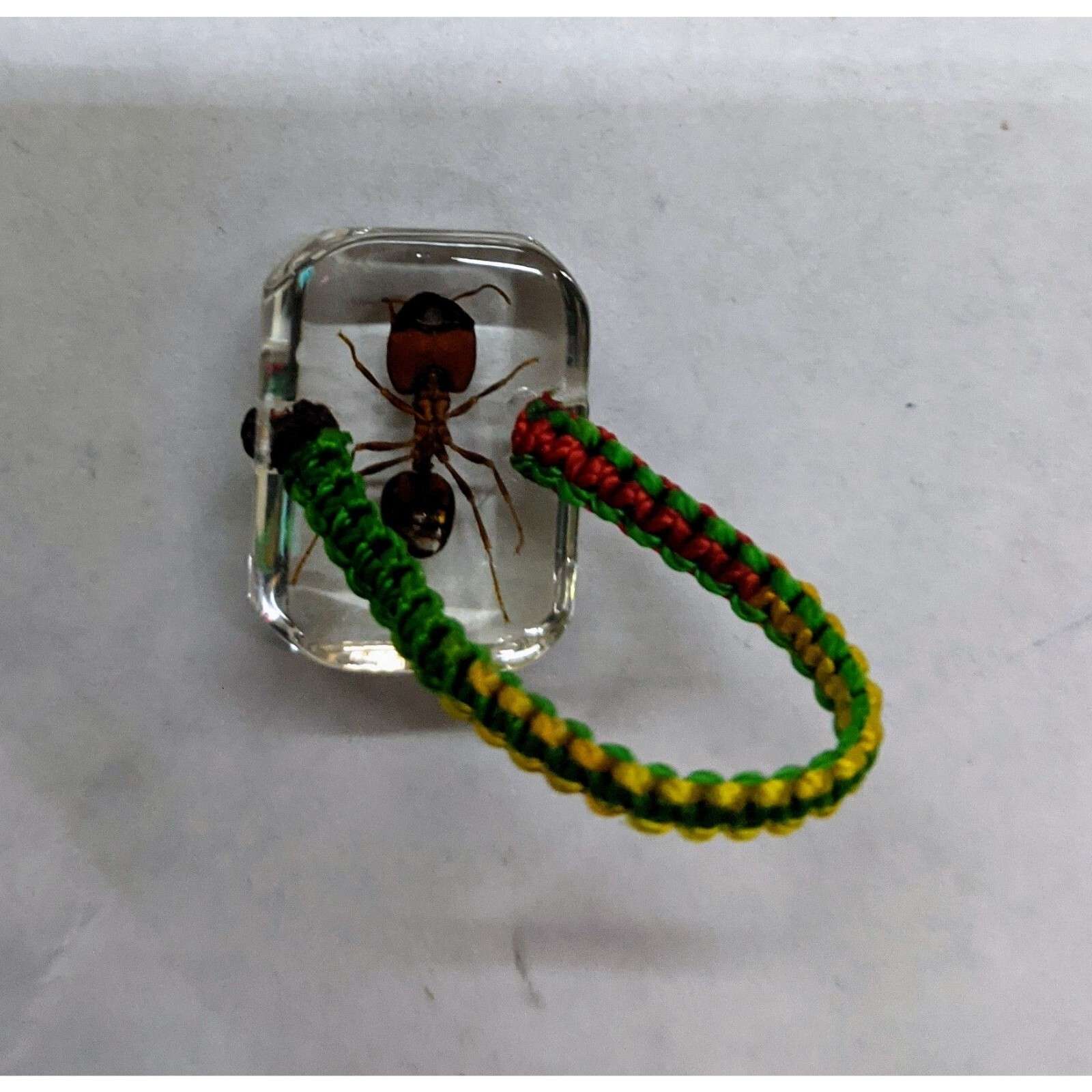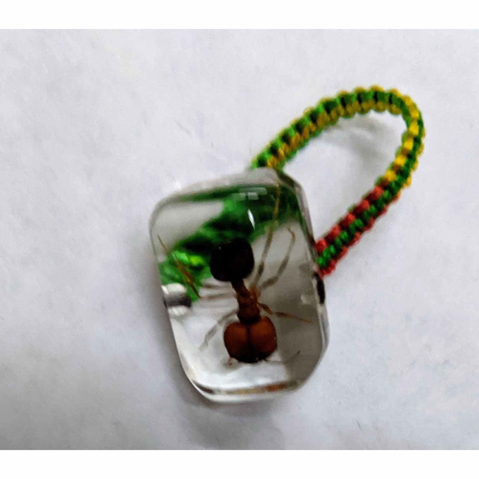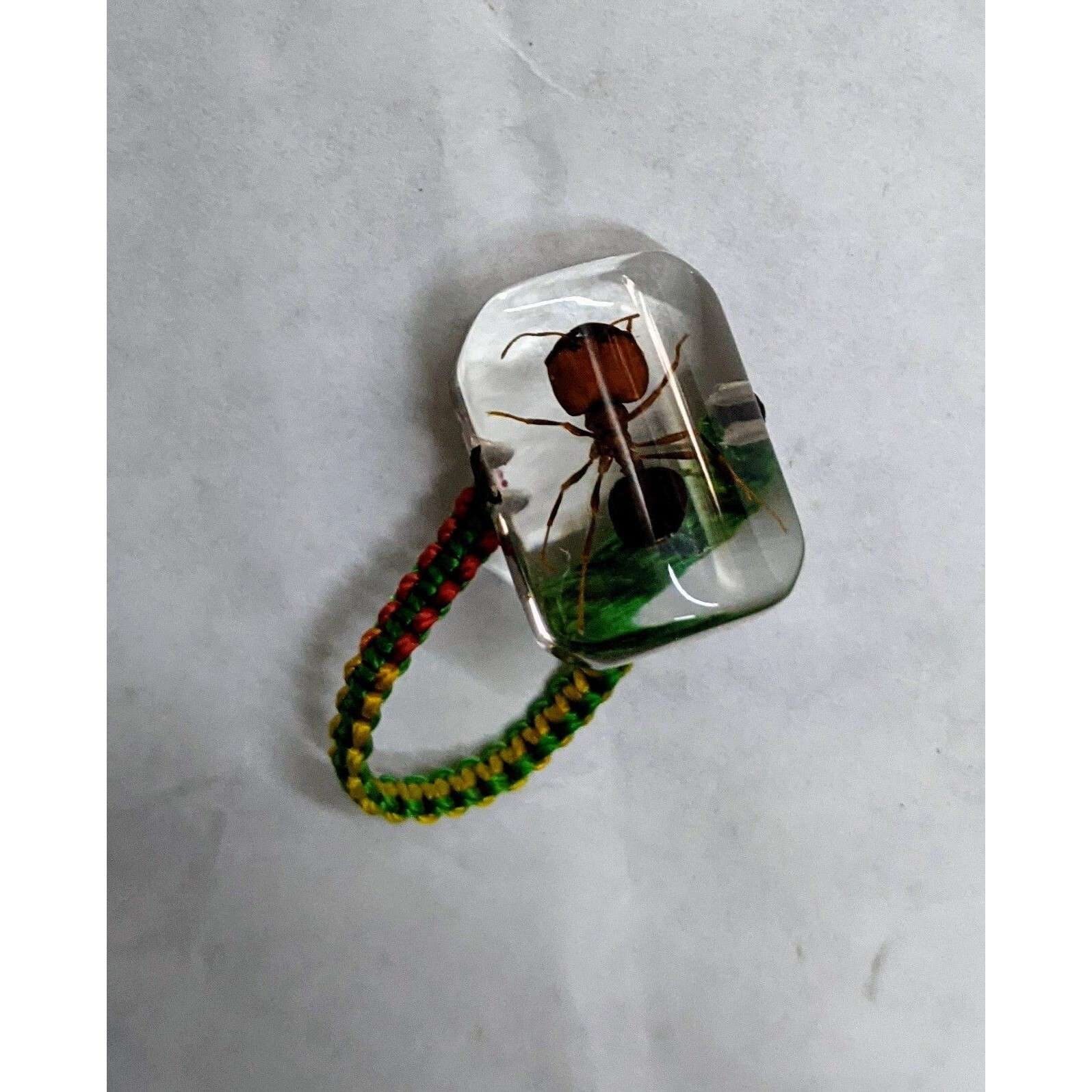 This is an ant in acrylic made into a ring by the Millennium Arts company. The part that goes on your finger is rainbow colored fabric and is very small. I have small hands and it barely fits on my pinky finger so I would suggest that this go on a necklace unless you have really small fingers.