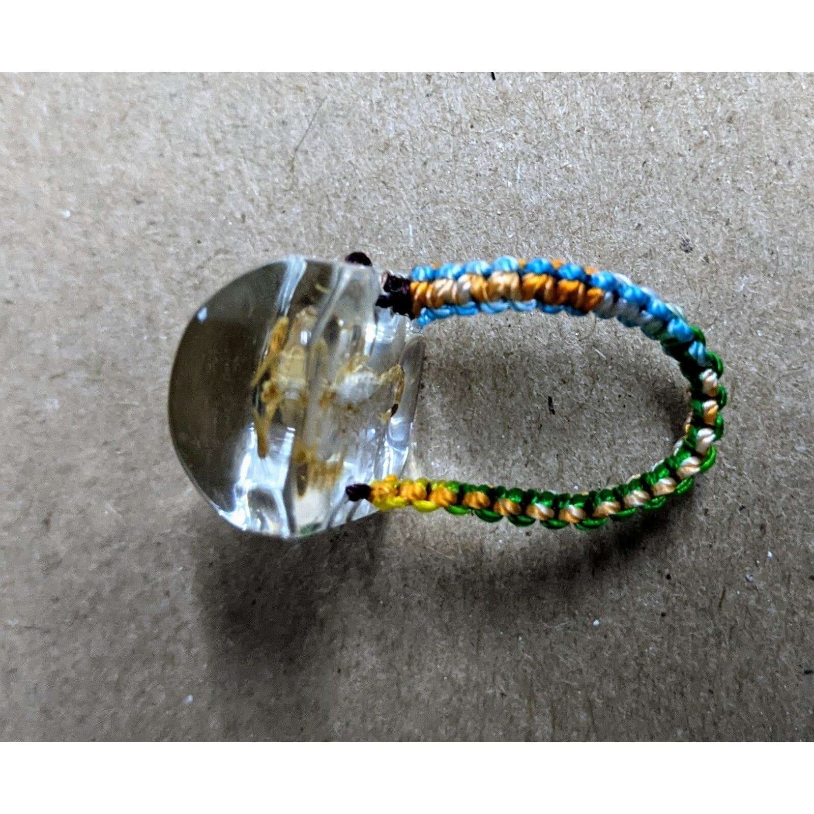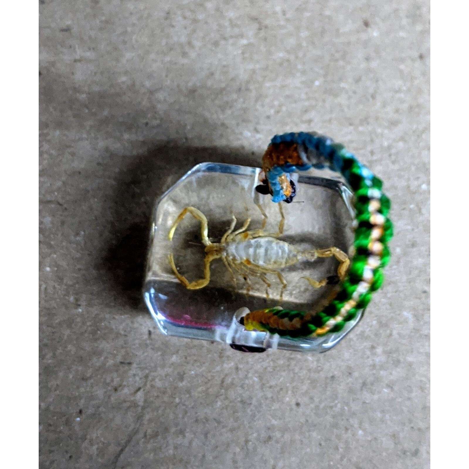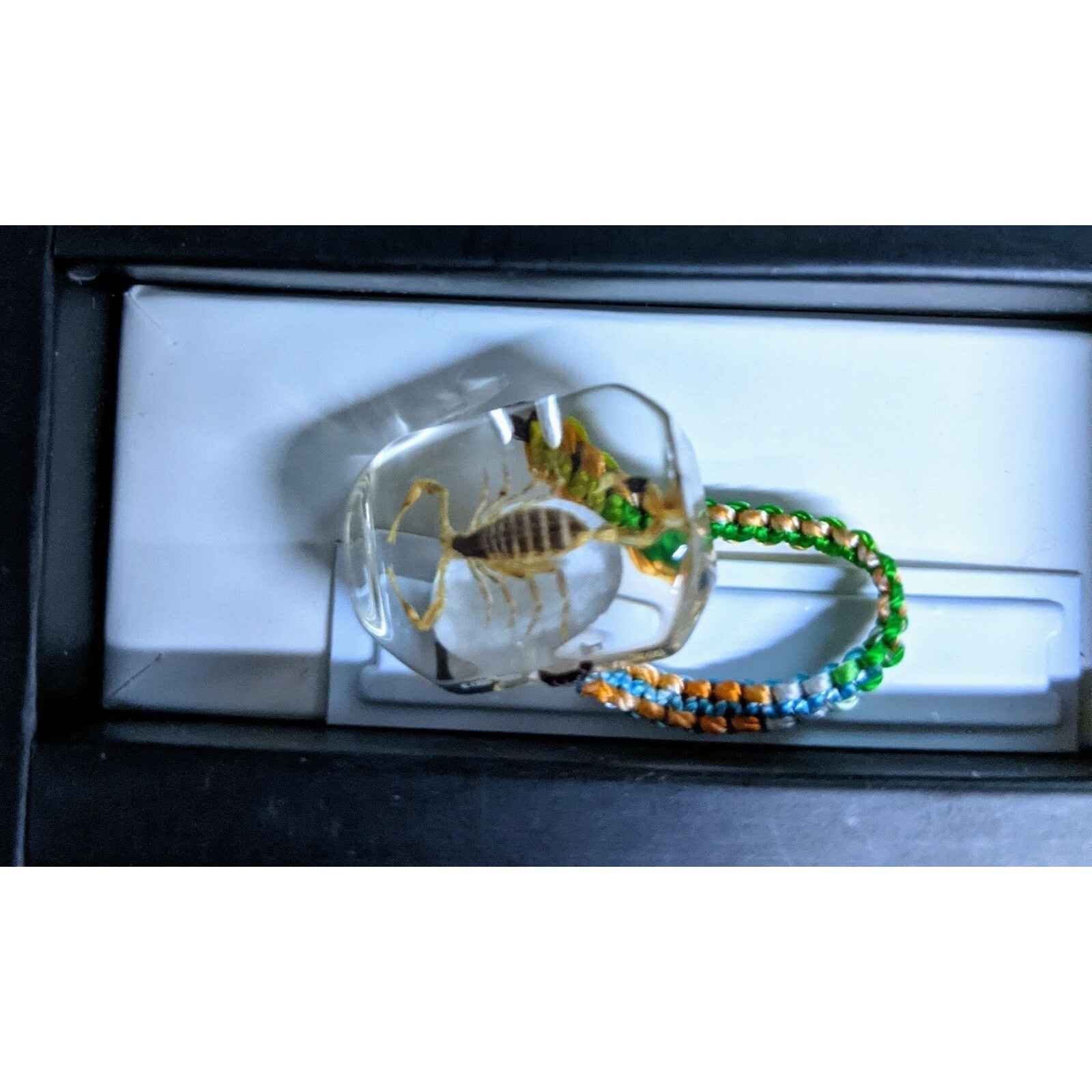 This is new in it’s original box. This is a Scorpion in acrylic made into a ring by the Millennium Arts company. The part that goes on your finger is various colors and made of fabric. The one in the picture is lighter colors. I have one with darker colors too. If you want specifically the dark or lighter colored one just ask and we can send you that specific one.