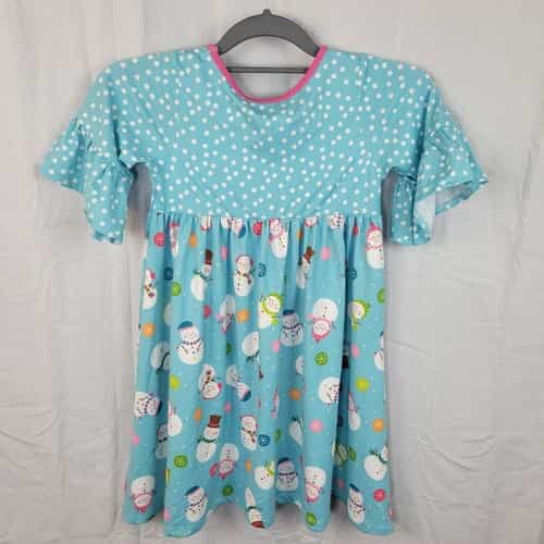 Adorable holiday print baby blue fit and flare short sleeve dress! The sleeves end with a little ruffle, the top print has fun white polka dots and the bottom print is covered in happy snowmen!