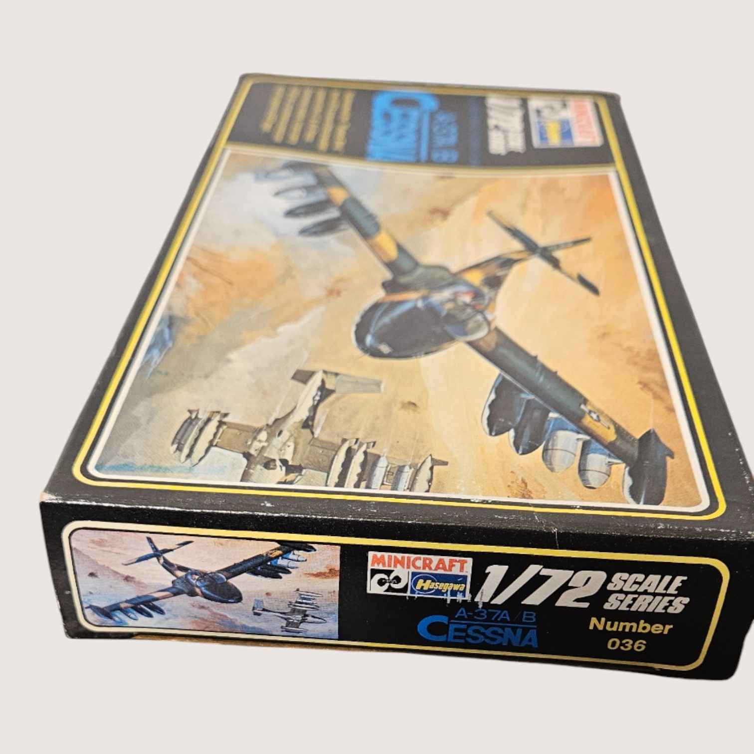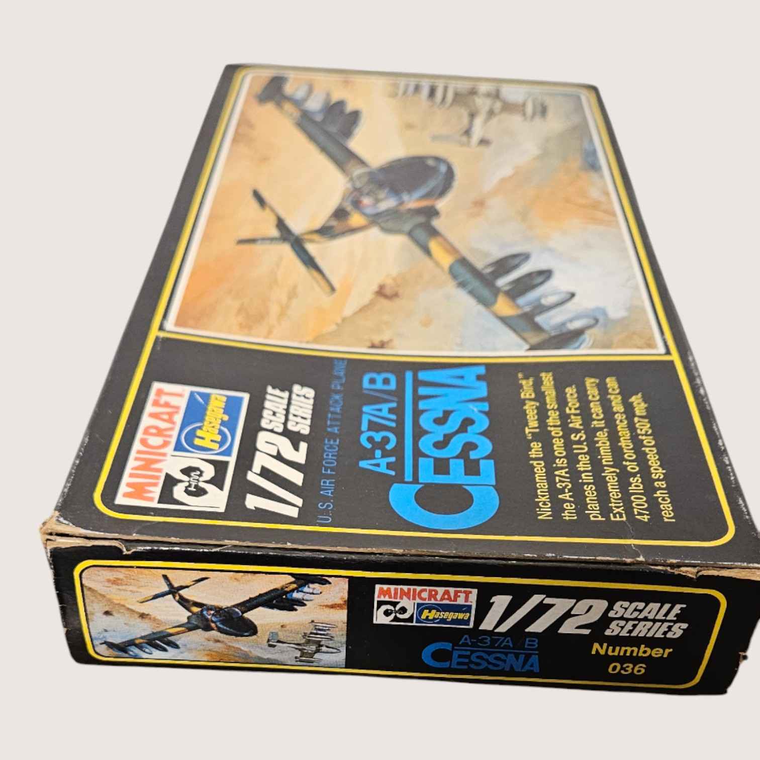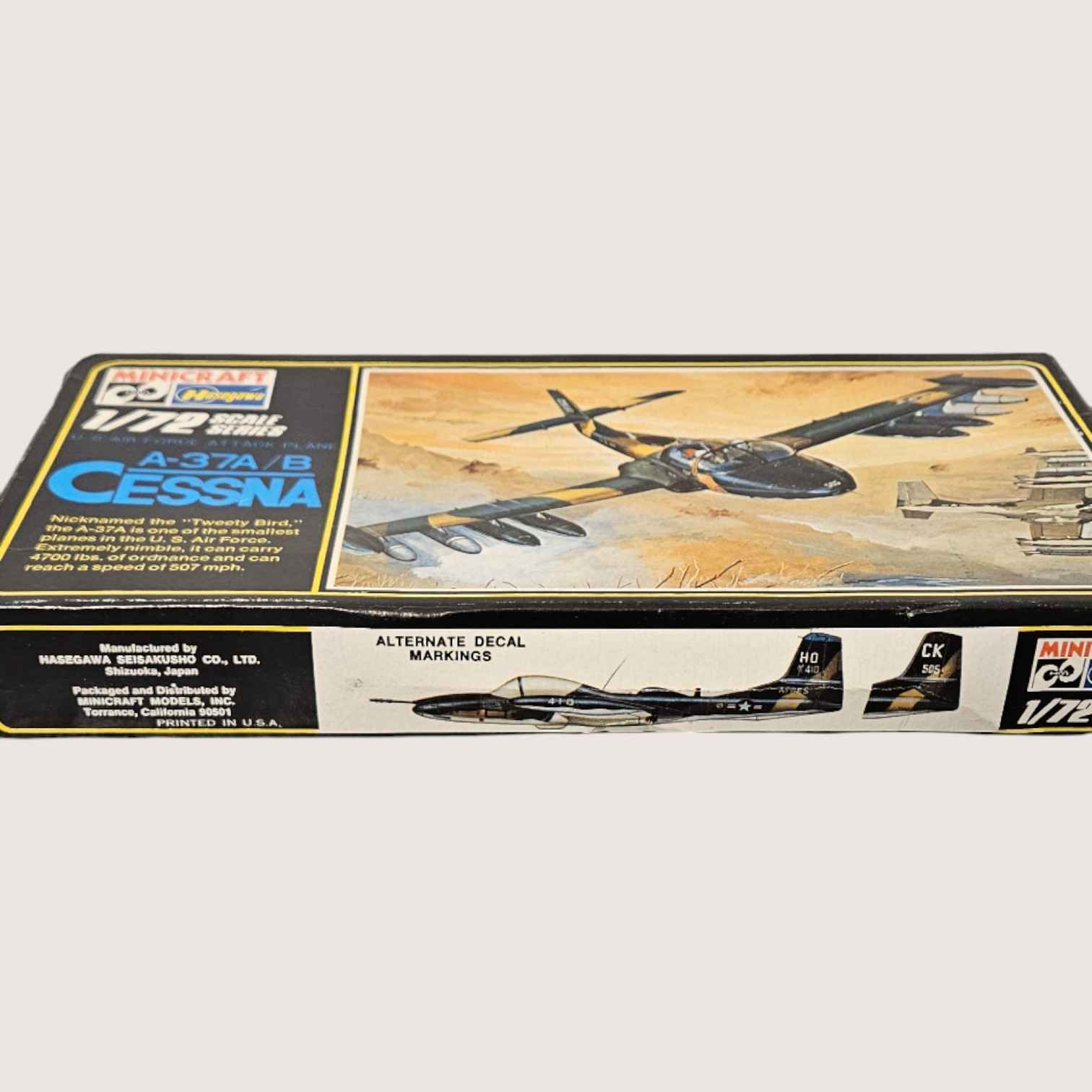 Model Airplane by Husgawa/Minicraft A37 A/B Cessna. Nicknamed the “Tweety Bird” one of the smallest planes in the US Air Force 1/72 Scale New in Box. Made in Japan. ITEM #4045