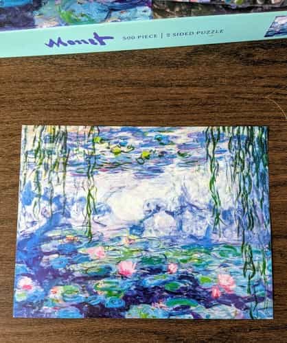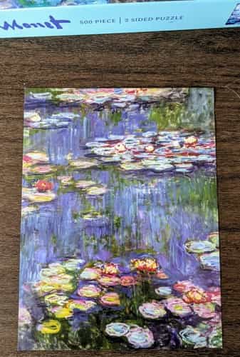 This puzzle is double sided. One side is a 500 piece puzzle of the Monet 1916 oil on canvas painting. The other side is a 500 piece puzzle of the Monet 1916-19 oil on canvas painting. Both called Water lilies but different paintings. Puzzle size is 24 inches by 18 inches.