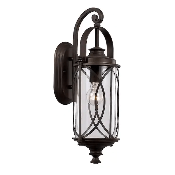 Enhance your porch, driveway or entryway with this 1-light outdoor wall lantern sconce. With an oil-rubbed bronze finish, the wet-rated, weather-resistant fixture creates a vintage feel, making it compatible with different exteriors. The lantern style and clear glass shade with metal scroll detail add decorative charm to your space.
