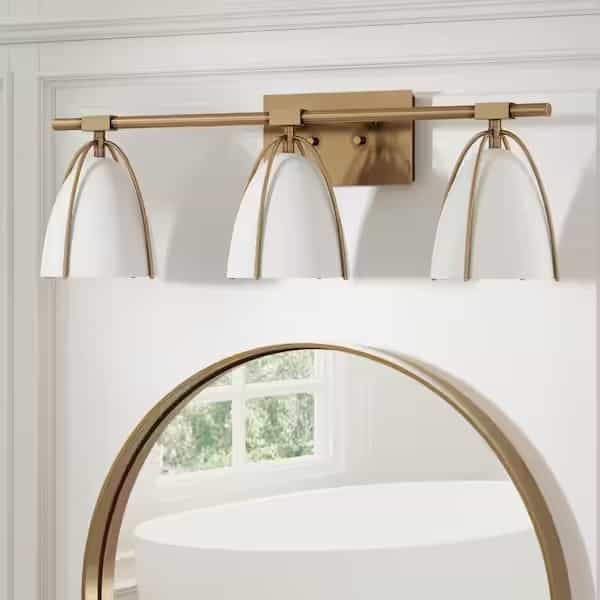 Nathan James 12901 Aubrey 29 in. 3-Light Gold Bathroom Vanity Light Fixture with Gold Metal Frame and White and Cage Shades