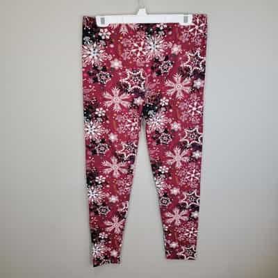 Soft and comfy pair of burgundy leggings made of polyester and spandex with a pretty snowflake print!