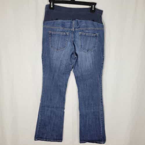 Classic blue denim flare leg 5-pocket jeans with a stretch panel leaving plenty of room for baby to grow!